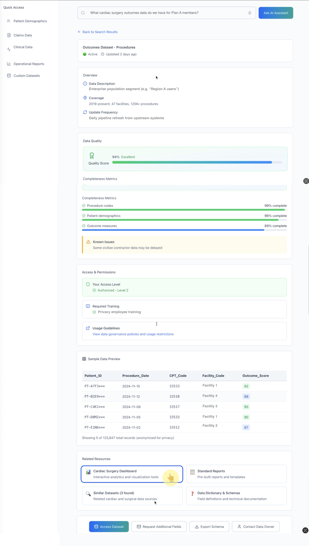*Dataset details make reliability legible (quality, completeness, known issues) and clarify governance requirements (permissions/training).