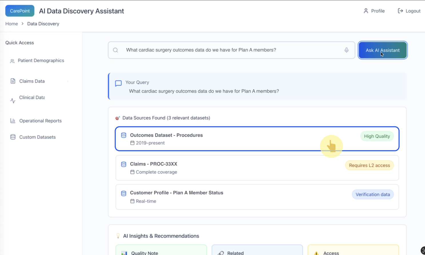 *AI proposes relevant data sources and surfaces trust/access constraints immediately—before the user goes deeper.